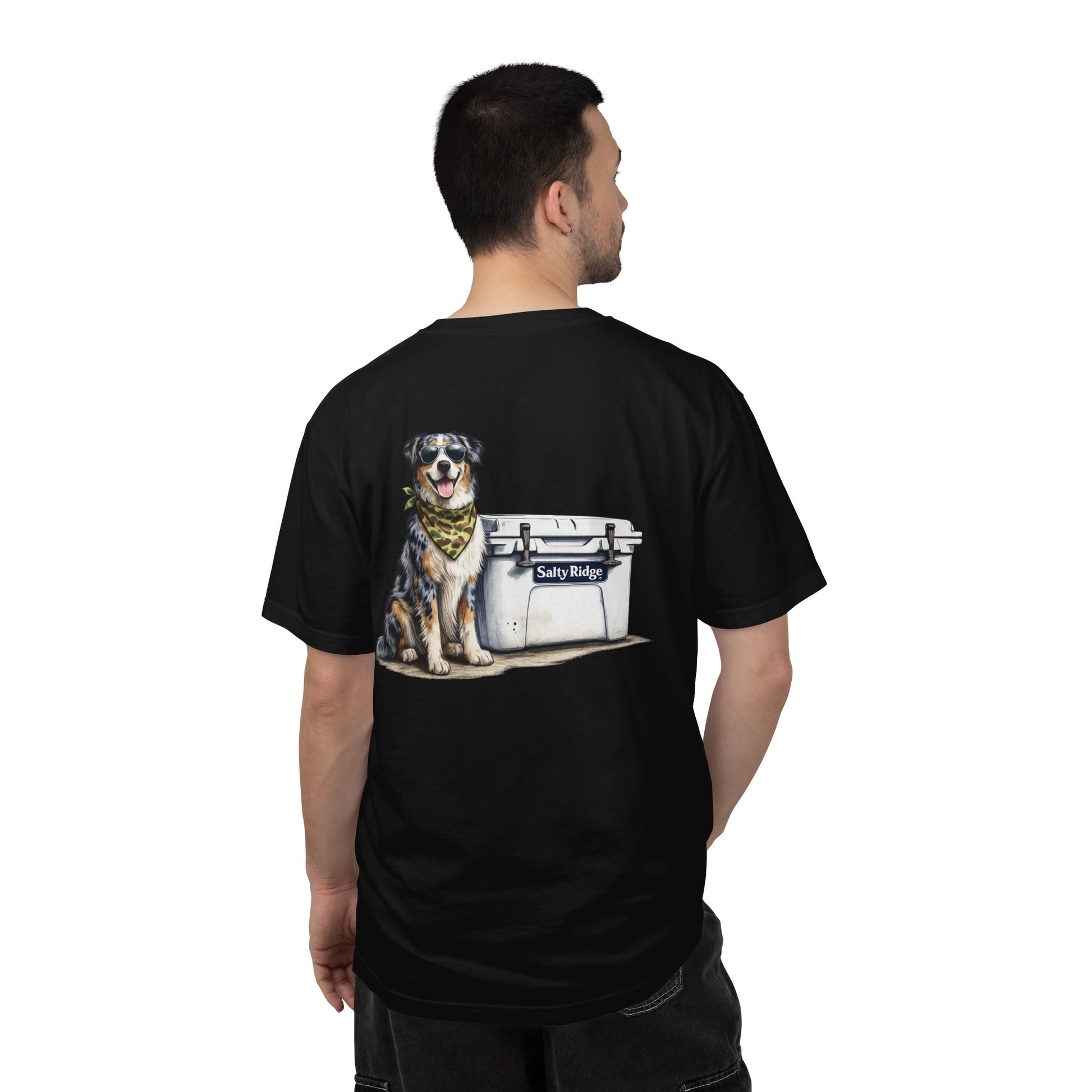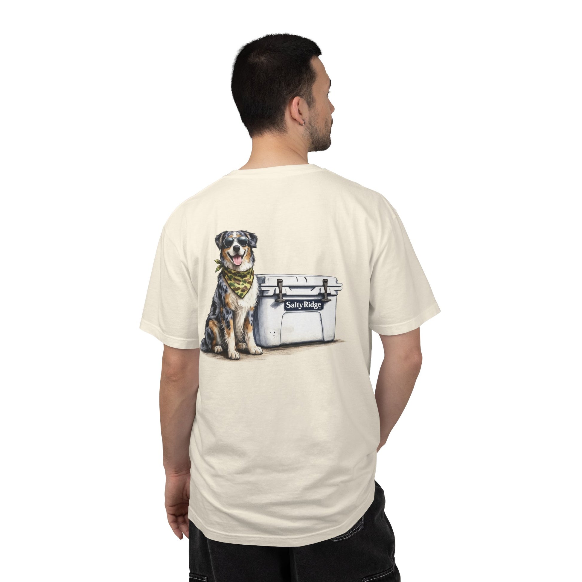 Lightweight but substantial, this garment-dyed tee carries a soft, lived-in feel from the first wear. The front bears a small chest script while the back shows a watercolor-style Australian Shepherd seated beside a rugged cooler—an easygoing scene that speaks to afternoons on the water, tailgate hangouts, and slow weekend drives. The relaxed cut and heavyweight cotton drape comfortably over layers, and the muted dye gives the shirt a mellow, vintage tone that fades into your everyday rotation. Wear it when you want to feel casual confidence and a quiet connection to outdoor moments with your dog by your side.